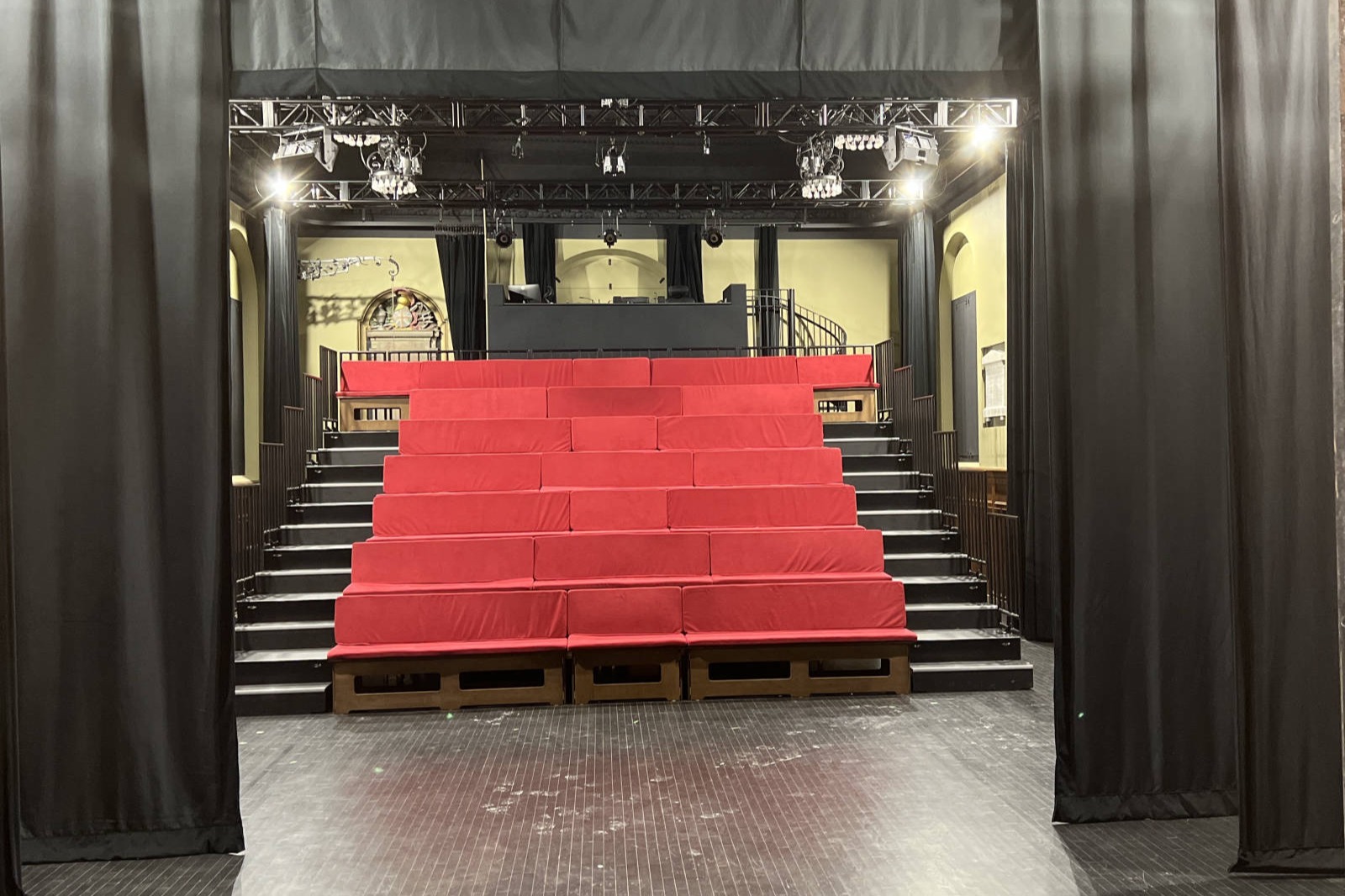 L’espace scénique est composé d’une section « scène » et d’une section « avant-scène » (5’-6’’ de profond) qui s’avance devant le manteau d’arlequin, voir plan technique. Il offre une plus grande proximité avec le public. Merci d’en tenir compte pour votre implantation et le rapport scène/salle voulu.