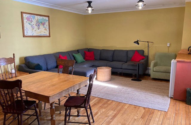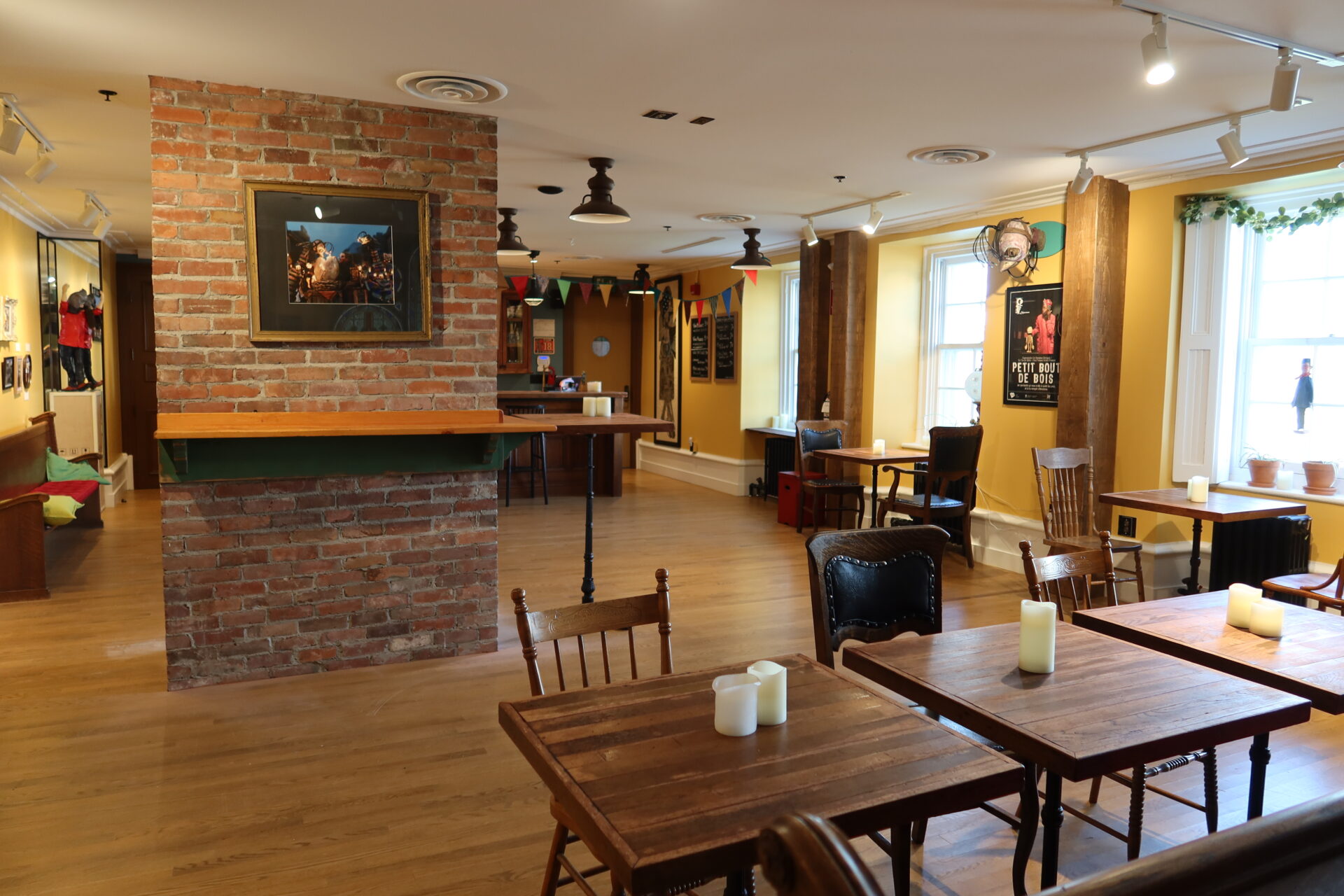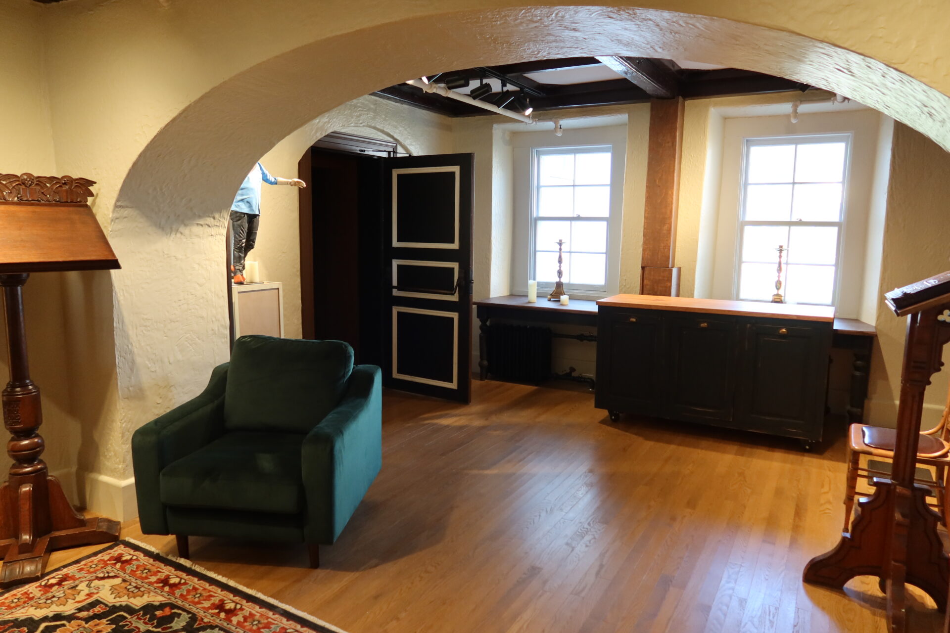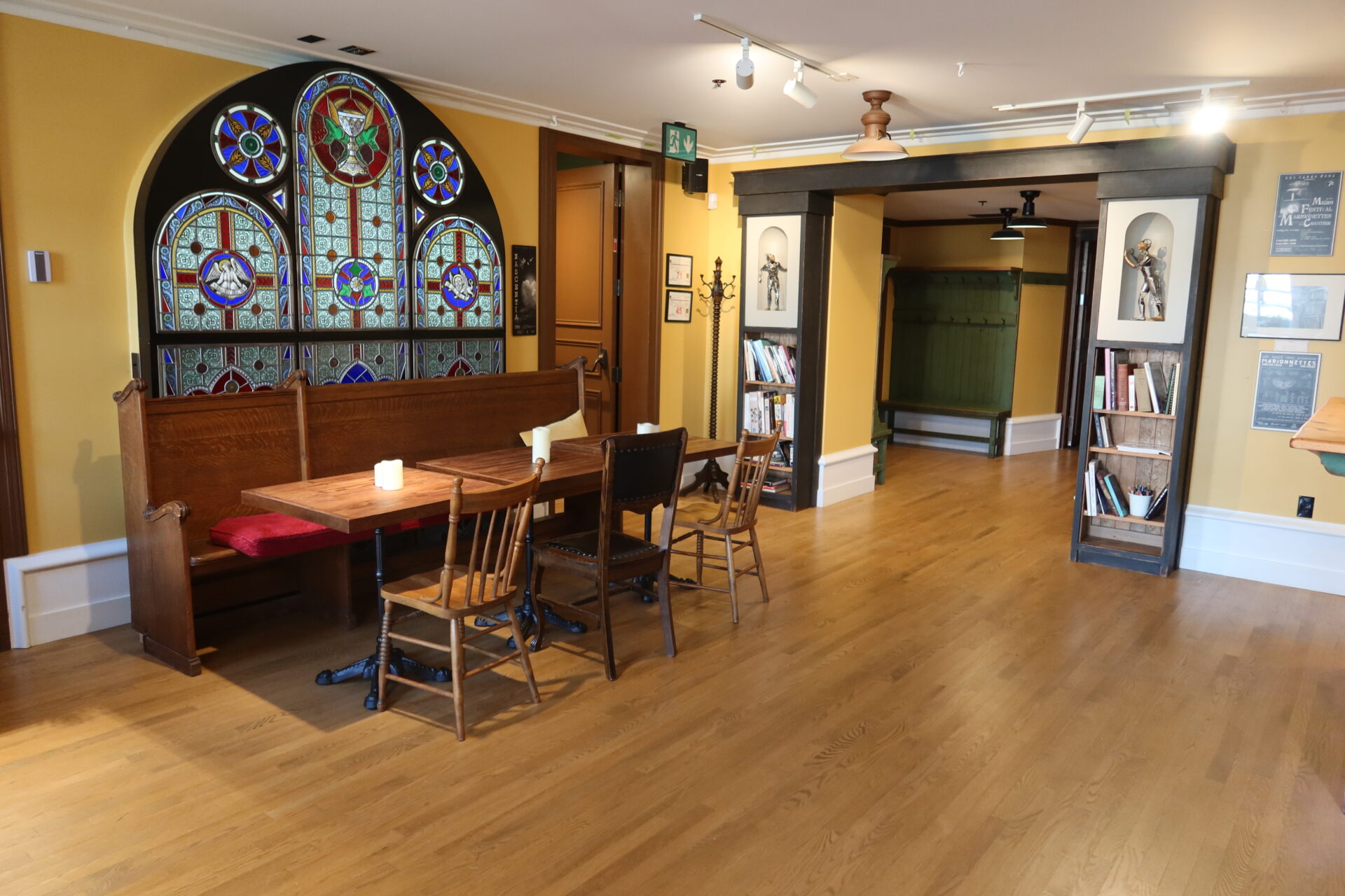 Situé dans le cœur du bâtiment, cette ancienne sacristie est un lieu de convivialité entre Les Sages Fous, les artistes en résidence et un public intéressé par le processus de création.