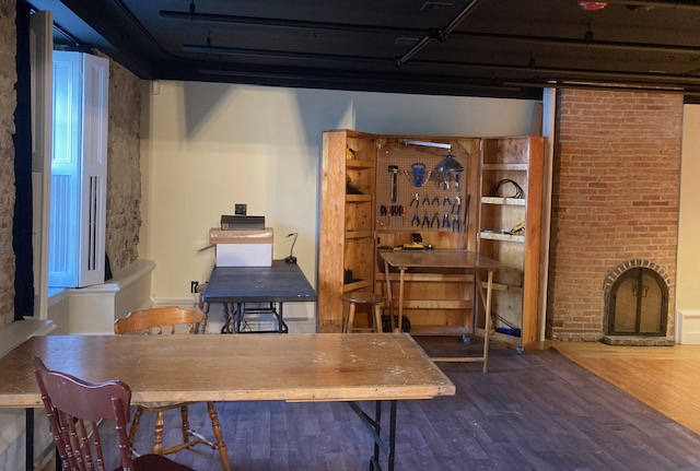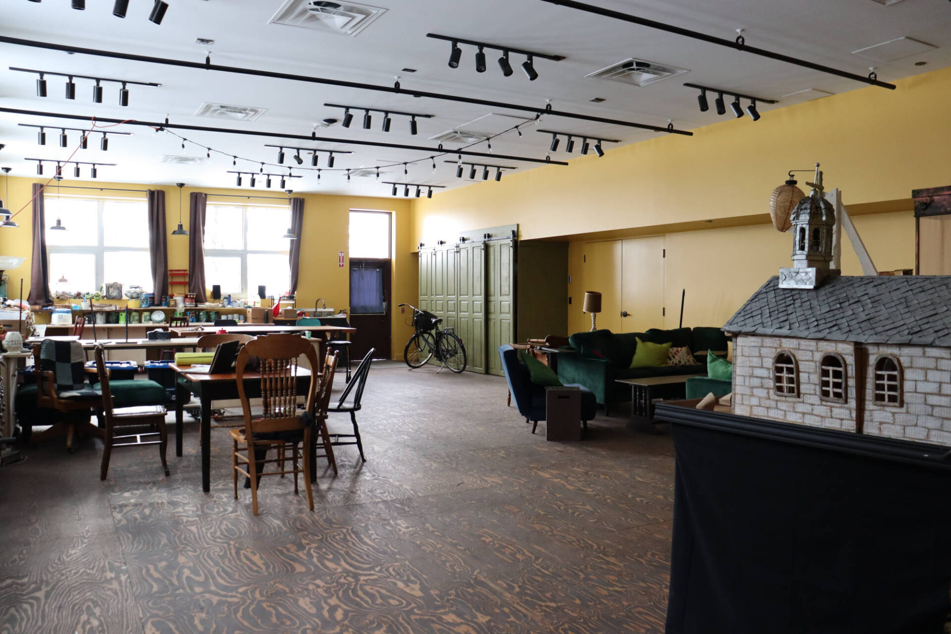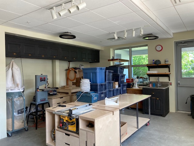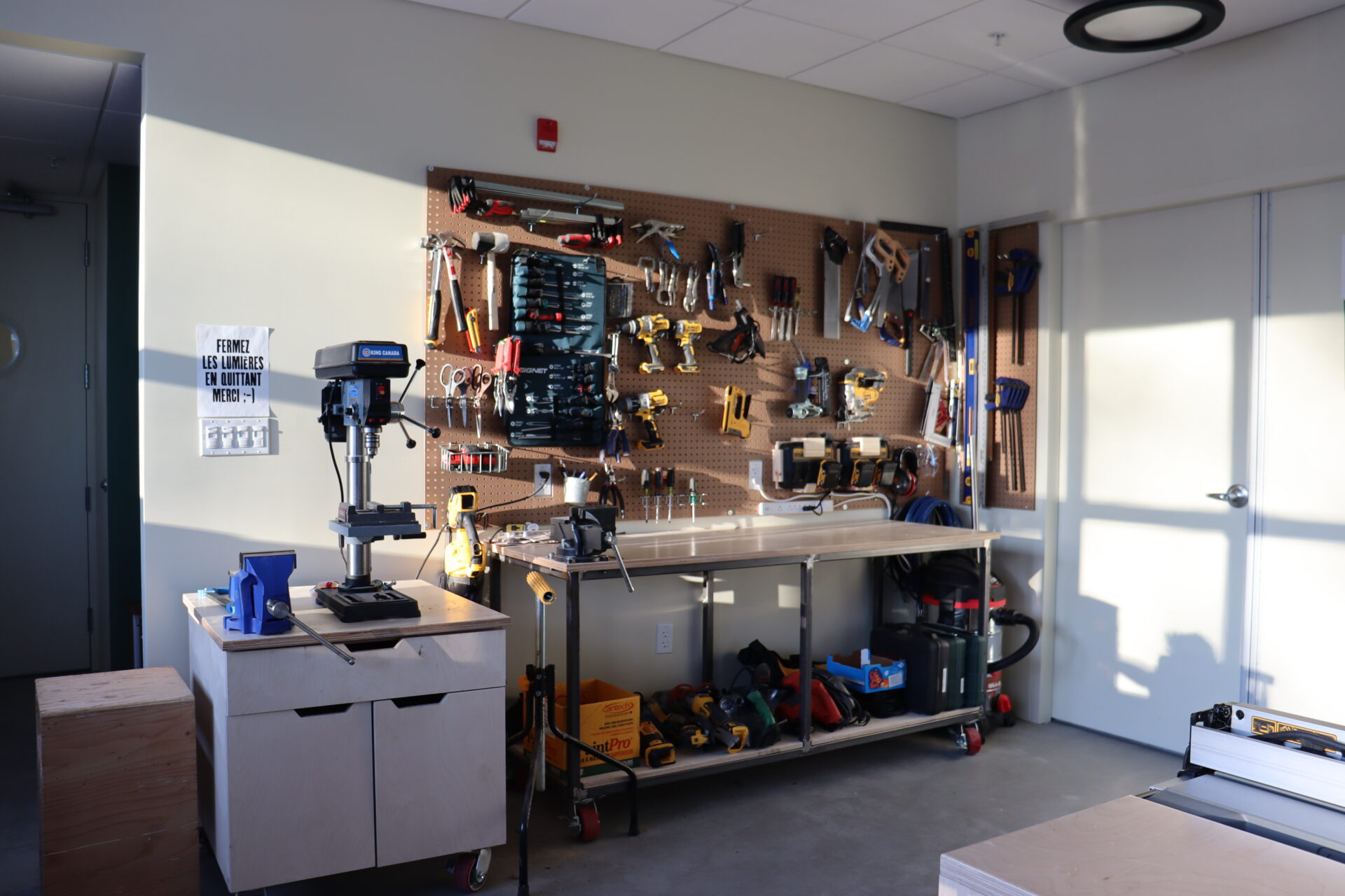 Elle est dotée d’équipements de fabrication légère et des équipements de son et d’éclairage de base. Une grande armoire se déploie contenant une table, des étagères, une machine à coudre, des fusils à colle et autres matériaux de base.