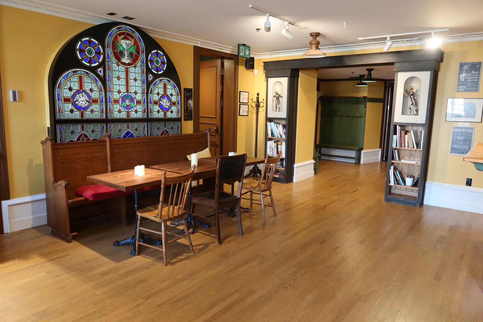Situé dans le coeur du bâtiment, cette ancienne sacristie deviendra un lieu de convivialité entre Les Sages Fous, les artistes en résidence et un public intéressé par le processus de création.